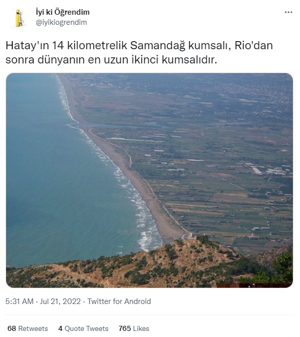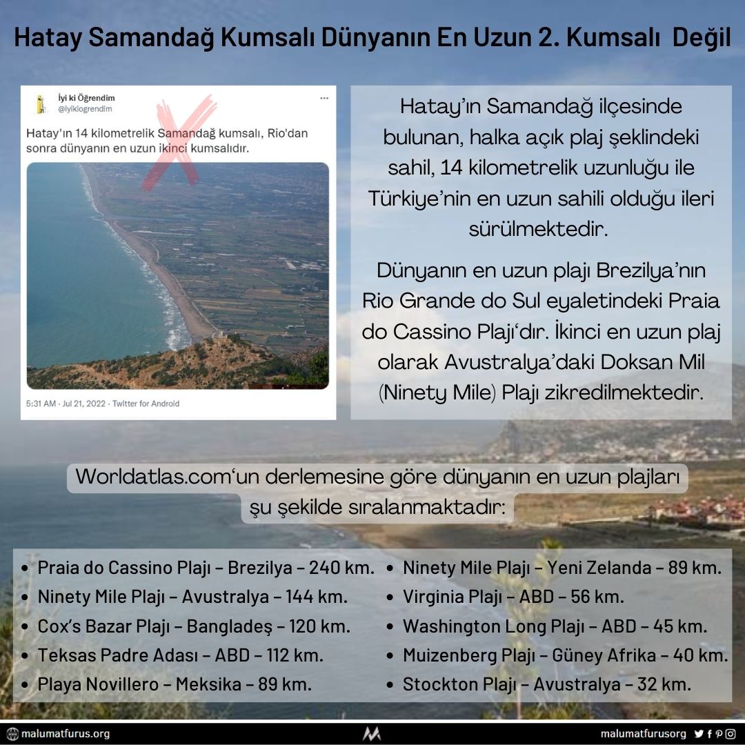 Hatay’ın 14 kilometrelik Samandağ kumsalının, Rio’dan sonra dünyanın en uzun ikinci kumsalı olduğu yönünde yanlış bir bilginin sosyal medyada paylaşıldığı görülüyor…