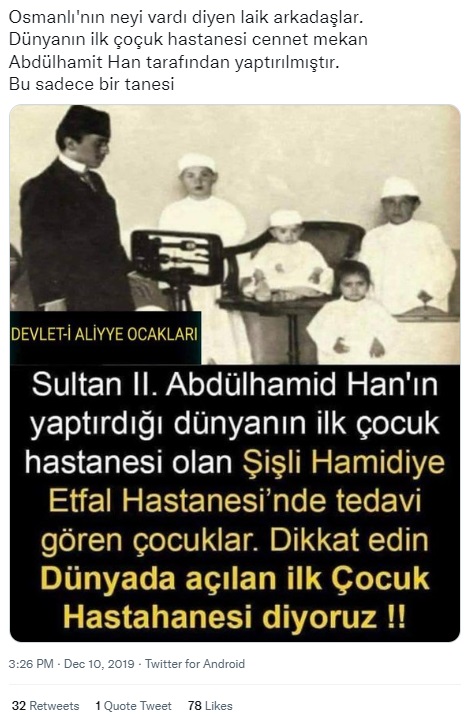 “Osmanlı’nın neyi vardı diyen laik arkadaşlar. Dünyanın ilk çoçuk hastanesi cennet mekan Abdülhamit Han tarafından yaptırılmıştır. Bu sadece bir tanesi”