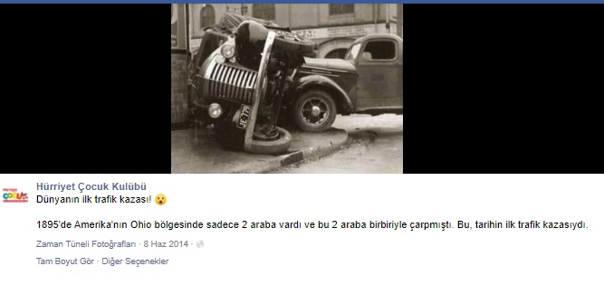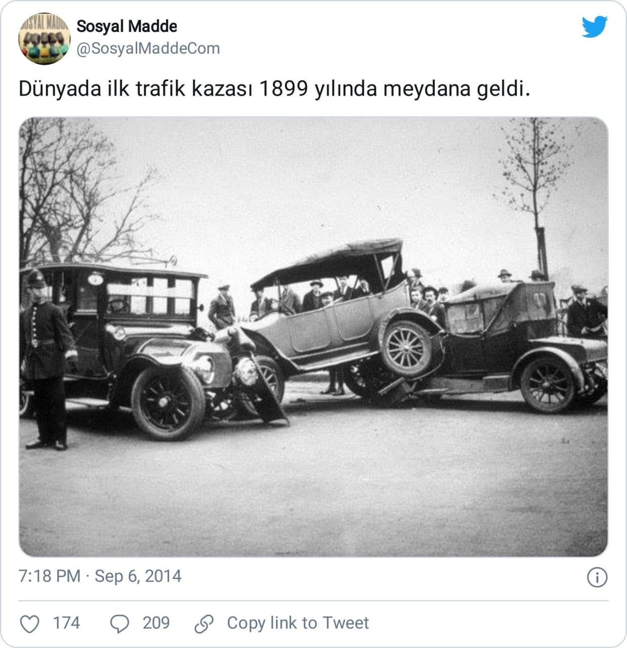 “Dünyada ilk trafik kazası 1899 yılında meydana geldi” notuyla bahse konu fotoğrafı aktaran örnek bir paylaşım şu şekilde sunulabilir: