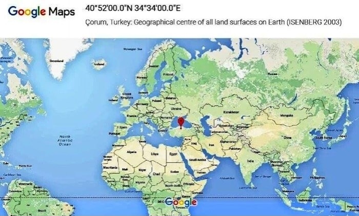 Bir Reddit kullanıcısının paylaştığı Google Mapsharita görseline göre dünya yüzeyinin coğrafik merkezi Çorum.