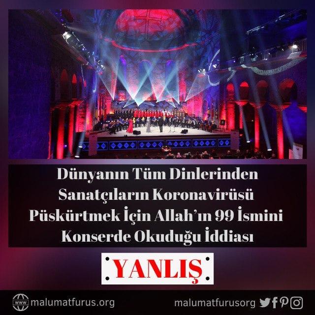 Paylaşılan video kaydında koronavirüsü püskürtmek amacı ile dünyanın tüm dinlerine mensup sanatçı ve müzisyenlerin Allah’ın 99 ismini zikrettiği iddiası gerçeği yansıtmıyor. Görüntüler TRT’nin daveti üzerine Aya İrini Kilisesi’nde konser veren Boşnak, Hırvat ve Sırp çocuklardan oluşan Saraybosna Fatih Sultan Mehmet Korosu’na ait.