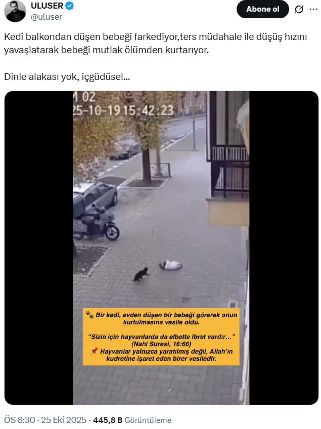 Uluser (@uluser): “Kedi balkondan düşen bebeği farkediyor,ters müdahale ile düşüş hızını yavaşlatarak bebeği mutlak ölümden kurtarıyor. Dinle alakası yok, içgüdüsel…”