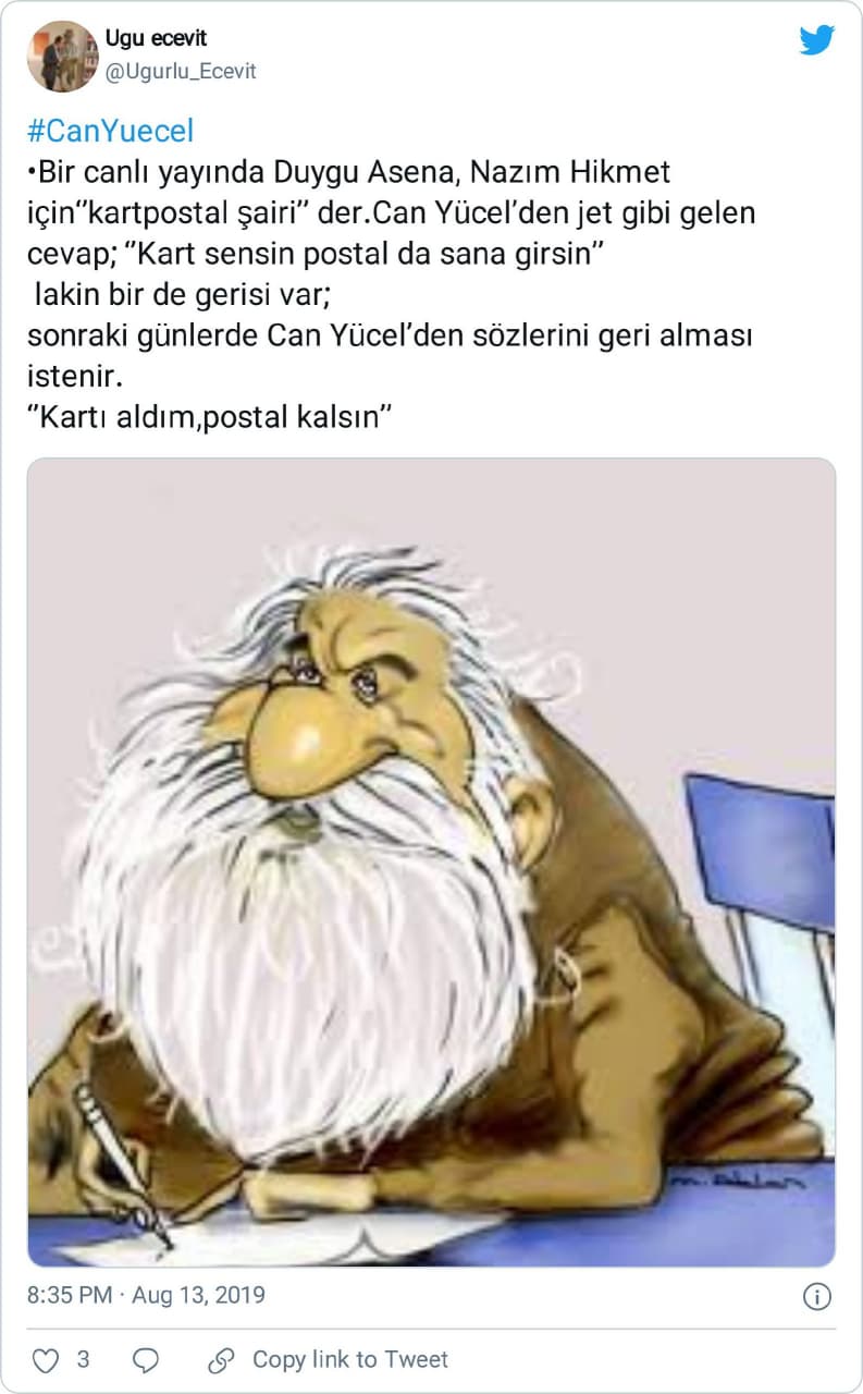 “Geçenlerde Duygu Asena köşesinde yazıyordu. Hani onunla ilgili ve hatta internet sinekleri devri öncesinden dolaştırılan bir ‘güzelleme’ vardır: Efendim Can Yücel’e: “Son dönemlerinde Nâzım Hikmet’in şiirleri biraz kartpostal gibidir” demişmiş de, Can Yücel de: “Kart sensin, postal da sana .” demişmişmiş.