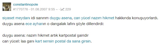 “siyaset meydanı idi sanırım duygu asena, can yücel nazım hikmet hakkında konuşuyorlardı. duygu asena ece ayhanın o dangalak lafını şöyle dillendirdi: duygu asena: nazım hikmet artık kartpostal şairidir can yücel: laa garıı kart sensin postal da sana girsin.”