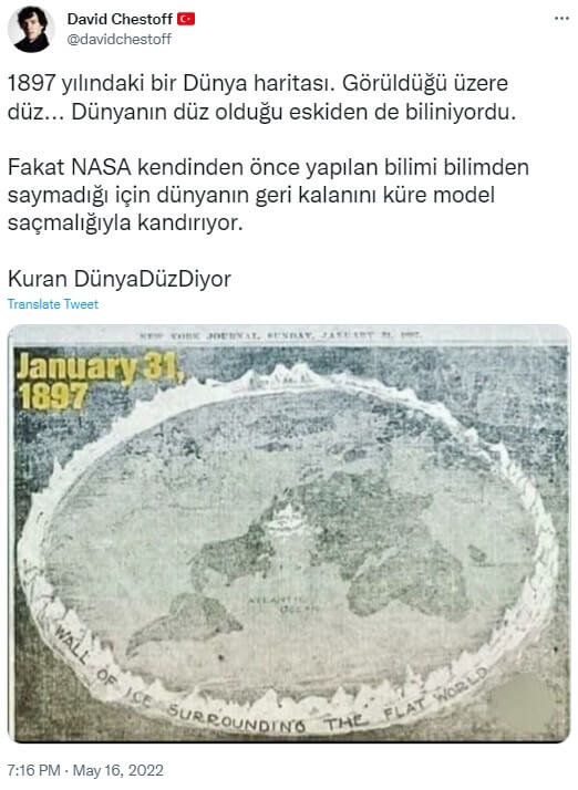 David Chestoff: “1897 yılındaki bir Dünya haritası. Görüldüğü üzere düz… Dünyanın düz olduğu eskiden de biliniyordu. Fakat NASA kendinden önce yapılan bilimi bilimden saymadığı için dünyanın geri kalanını küre model saçmalığıyla kandırıyor. Kuran DünyaDüzDiyor”
