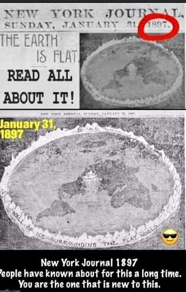 Metehan Kutluay: “NEW YORK JOURNAL PAZAR, 31 OCAK 1897 DÜNYA BUNA GÖRE DÜZ! DÜZ DÜNYAYI ÇEVRELEYEN BUZ DUVARI New York Journal 1897 İnsanlar bunu uzun zamandır biliyorlar. Bu işte yeni olan sensin!”