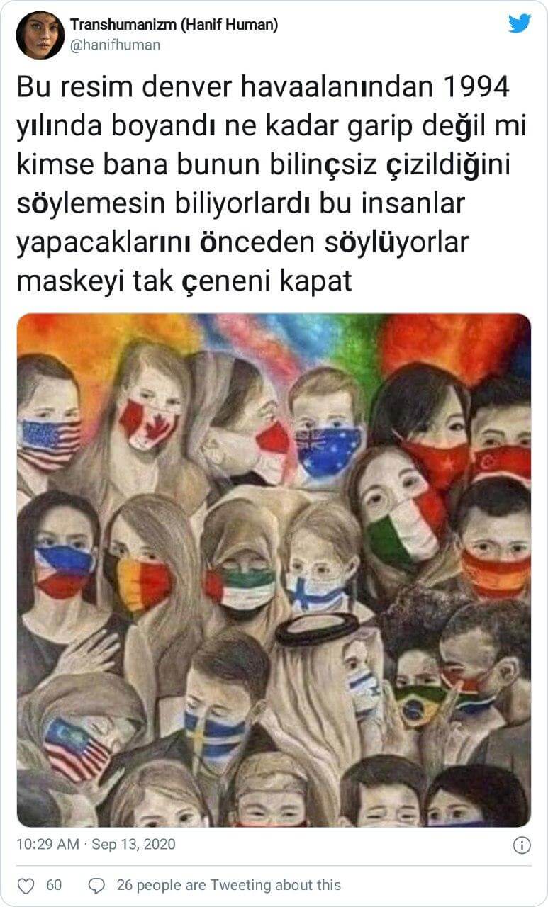 Yukarıda da aktarıldığı üzere farklı ülkelerin bayraklarını taşıyan maskeleri takan farklı uluslardan insanların resmedildiği tablo 1994 yılında Denver Havaalanı’na asılmadı, koronavirüs salgını ortaya çıktıktan sonra 2020 yılında oluşturuldu ve paylaşıldı.