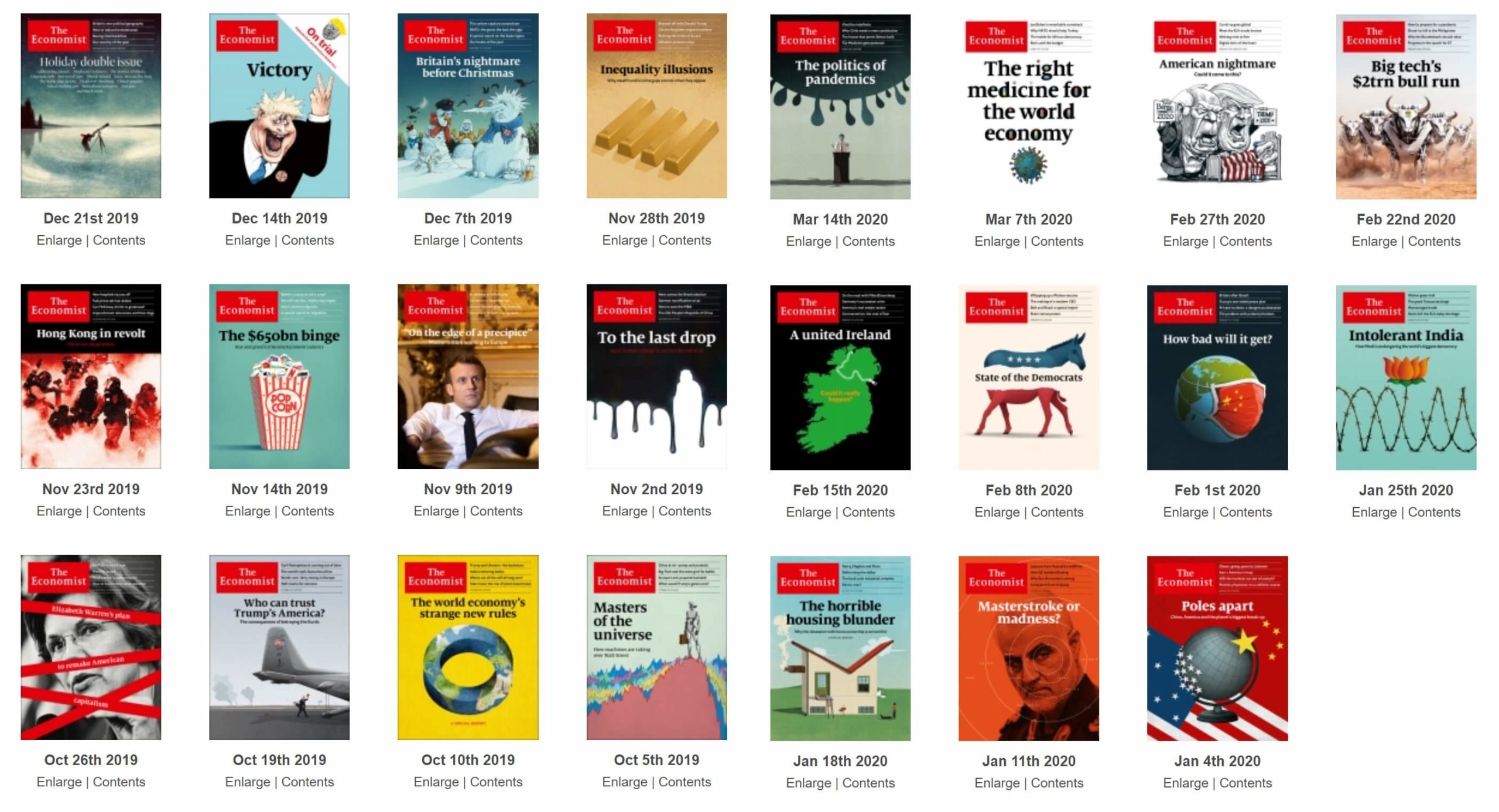 Ancak iddianın aksine, The Economist’in koronavirüs salgınını öngördüğü komplo teorisine mesnet olarak sunulan görsel, derginin kapağında yer almamış. 2019 yılı Ekim ayından 14 Mart 2020 tarihine kadar değin yayınlanan kapaklarını incelediğimizde ilgili görselin bulunduğu bir kapağın bulunmadığı görülüyor (The Economist, farklı bölgeler için farklı kapak ile yayınlanabiliyor. Bu nedenle, farklı bölgeler için yayınlanan farklı versiyonlar için incelemeyi genişlettiğimizde de aynı sonuca ulaşıyoruz).