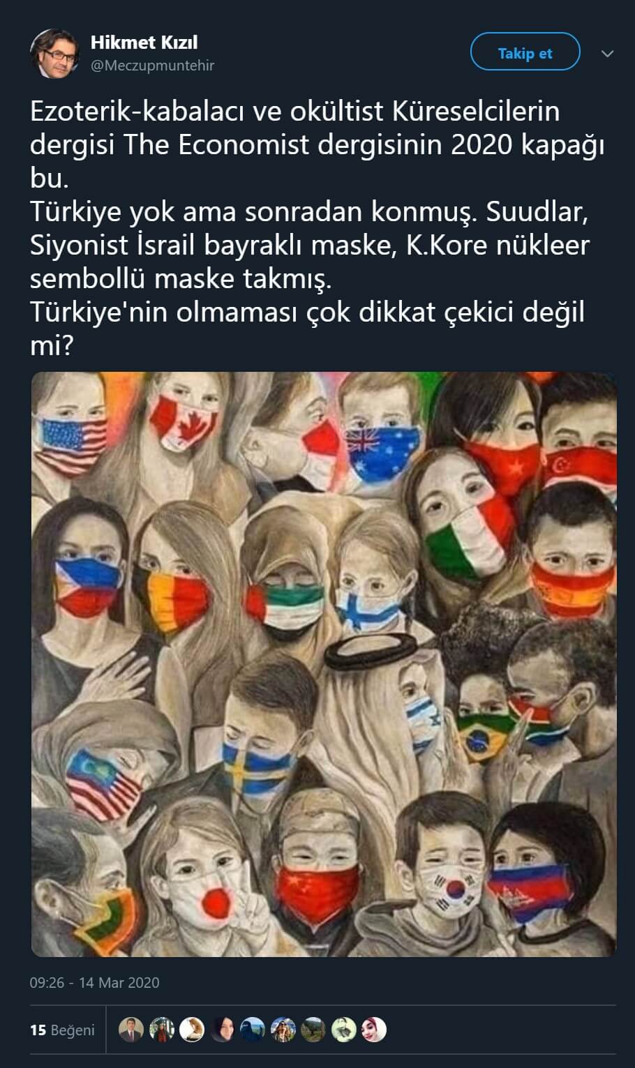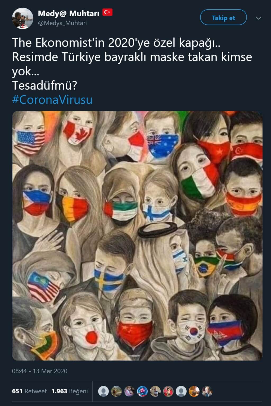 Sosyal medyada yapılan bazı paylaşımlarda farklı ülkelerin bayrak desenlerine sahip maskeleri takan insanların yer aldığı görselin The Economist dergisinin 2020 yılına ait kapağı olduğu iddia edildi.
