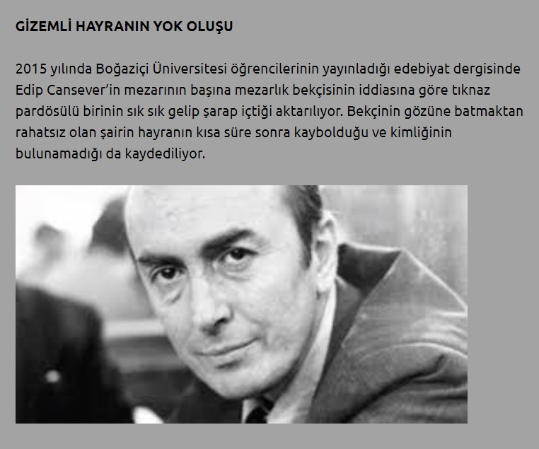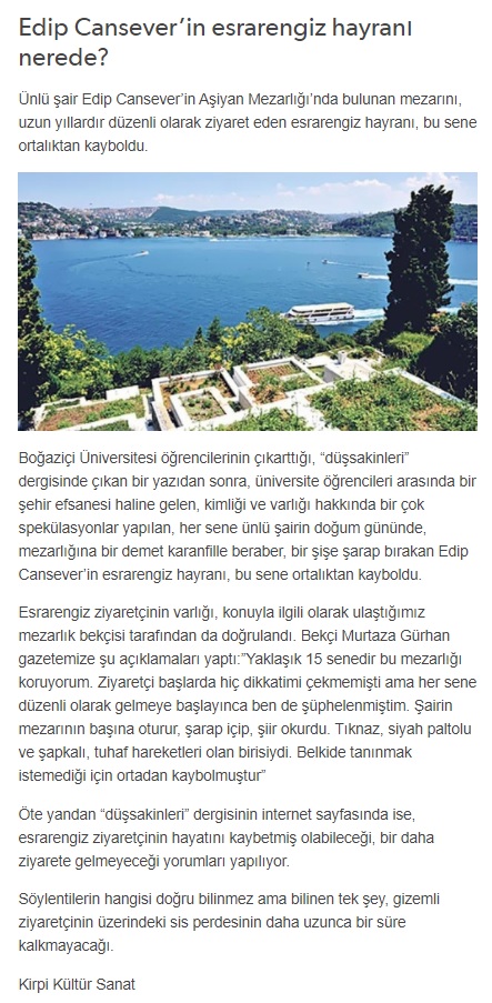 Boğaziçi Üniversitesi öğrencilerinin çıkarttığı, “düşsakinleri” dergisinde çıkan bir yazıdan sonra, üniversite öğrencileri arasında bir şehir efsanesi haline gelen, kimliği ve varlığı hakkında bir çok spekülasyonlar yapılan, her sene ünlü şairin doğum gününde, mezarlığına bir demet karanfille beraber, bir şişe şarap bırakan Edip Cansever’in esrarengiz hayranı, bu sene ortalıktan kayboldu.