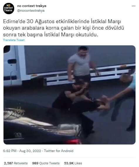 “Edirne’de 30 Ağustos etkinliklerinde İstiklal Marşı okuyan arabalara korna çalan bir kişi önce dövüldü sonra tek başına İstiklal Marşı okutuldu.”
