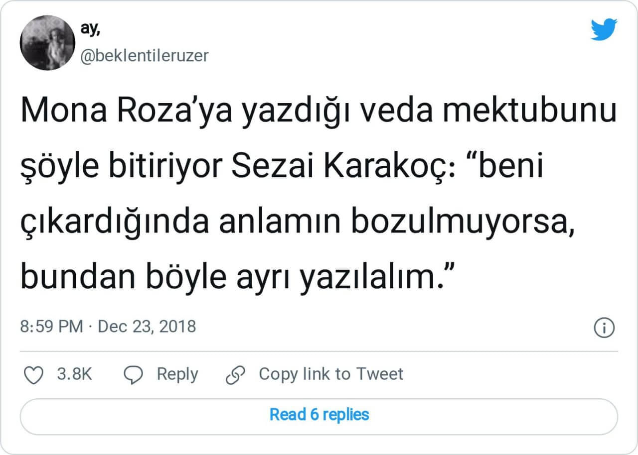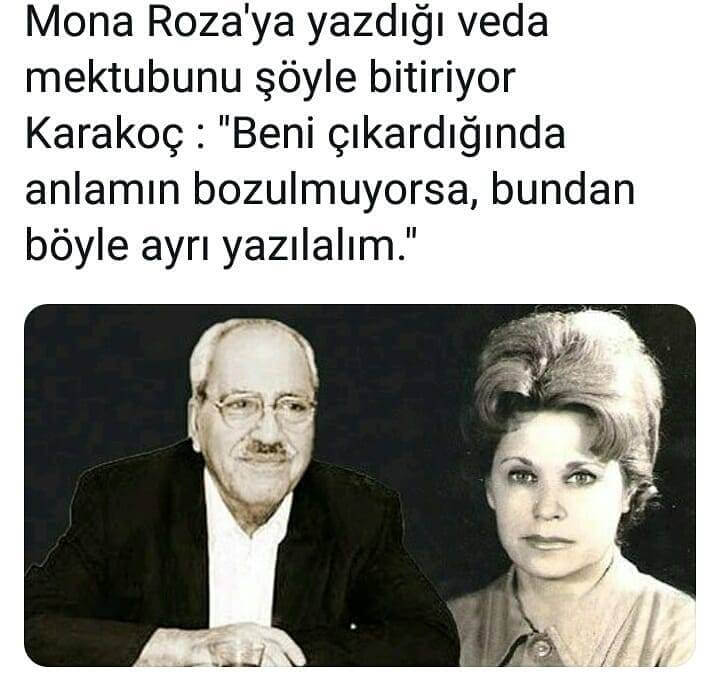 “Mona Rozaya yazdığı veda mektubu şöyle bitiriyor Karakoç; ” Eğer beni çıkardığında anlamın bozulmuyorsa bundan böyle ayrı yazılalım.””