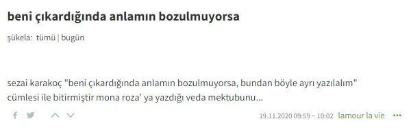- Sezai Karakoç’un “Mona Roza’dan ayrıldıktan sonra şiir yazmayı neden bıraktınız?” sorusuna “hayatın öznesini kaybedince devrik olur tüm cümlelerin” yanıtını verdiği