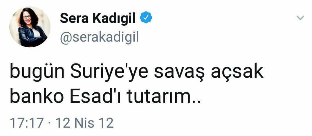 Suriye’de yaşanan gelişmelerle birlikte sıklıkla sosyal medyada gündeme gelen TİP İstanbul Milletvekili ve Parti Sözcüsü Sera Kadıgil’in 2012 yılında attığı “Bugün Suriye’ye savaş açsak banko Esad’ı tutarım..” tweetinin arşiv bağlantısına ise erişilebiliyor.