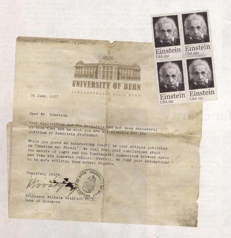 Doktora başvurunuz şu aşamada başarılı bulunmadı ve bu nedenle Doçentlik pozisyonu için uygun görülmediniz. “Annalen der Physik”te yayınlanan makalenizde ilginç bir teori ortaya koyarken, ışığın doğası ve uzay ve zaman arasındaki temel bağlantı hakkındaki görüşlerinizin biraz radikal olduğunu düşünüyoruz. Genel olarak, varsayımlarınızın gerçek fizikten ziyade sanatsal buluyoruz.