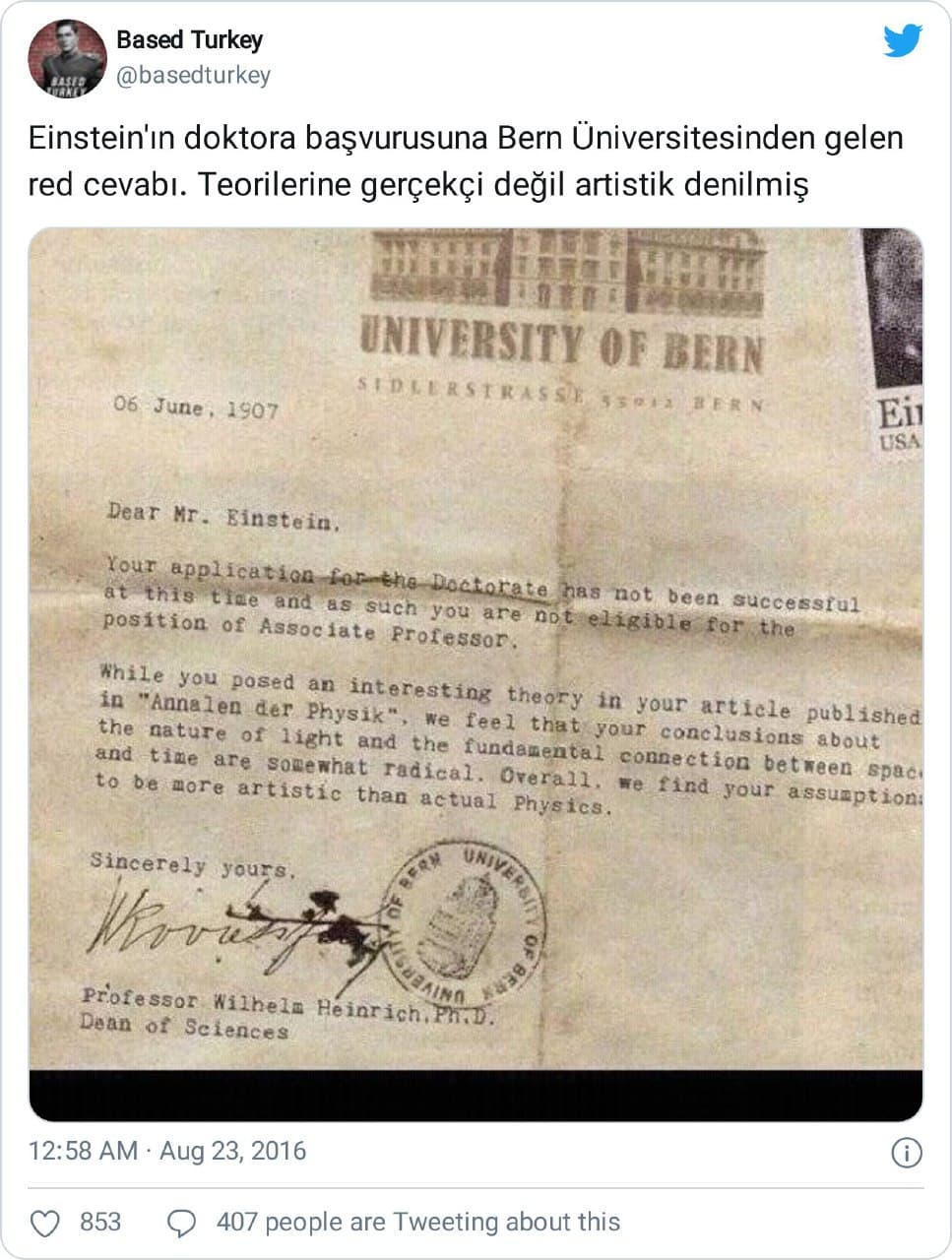 “Einstein’ın doktora başvurusuna Bern Üniversitesinden gelen red cevabı. Teorilerine gerçekçi değil artistik denilmiş” notuyla bahse konu mektup görselini aktaran bir örnek paylaşım şu şekilde: