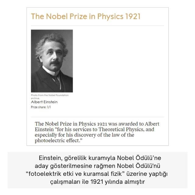 Albert Einstein 1921 Nobel Fizik Ödülü’nü “İzafiyet /Görelilik Kuramı” ile değil “Fotoelektrik Etkisi” üzerindeki çalışmasıyla almıştır.