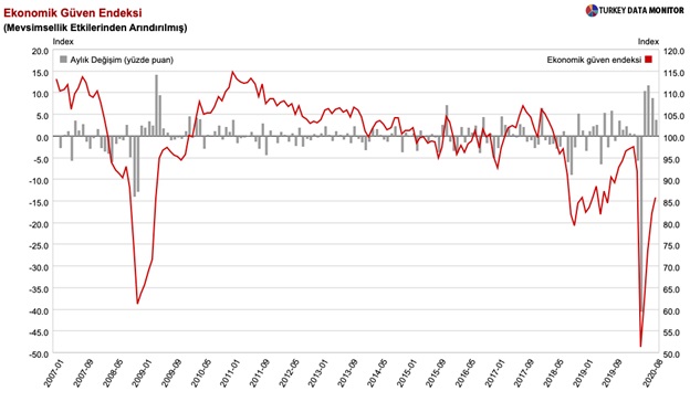 Görüleceği üzere inişler çıkışlar olsa da endeks sürekli 100’ün altındadır. Bu veriler de göstermektedir ki, ekonomik aktörlerin ülkemiz ekonomisine dair beklentileri iki yıldır kötümserdir. Covid-19 salgınının zirve yaptığı Nisan ayında 50 seviyelerine düşen endeks sonrasında yükselmektedir. Ancak hala 100’ün altında olması, beklentilerin henüz iyimser denilebilecek düzeye çıkmadığına işaret etmektedir.