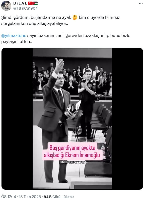 Mahkeme salonunda duruşmayı izleyenlerin “Ekrem Başkan” sloganıyla alkışladığı anlar izlendiğinde bahsi geçen kolluk görevlisinin Ekrem İmamoğlu’nu alkışlamadığı görülebiliyor.