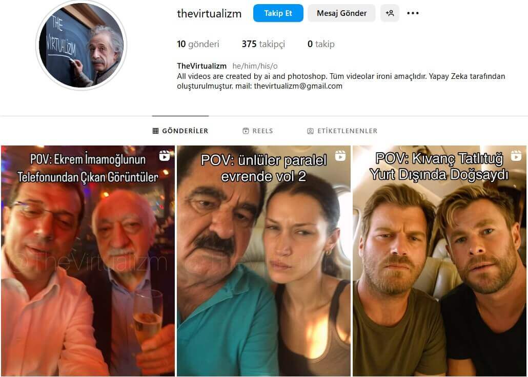 Üzerinde thevirtualizm filigranı bulunan videonun “Ekrem İmamoğlu’nun telefonundan çıkan görüntüler” notunu içeren bahse konu görselin kaynağı TheVirtualizm adlı yapay zekâ uygulaması ve photoshop programları ile hazırladığı görüntüleri paylaşan Instagram profili.