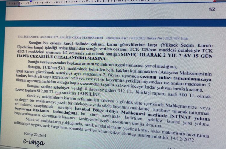 İstanbul Büyükşehir Belediye Başkanı Ekrem İmamoğlu hakkında Yüksek Seçim Kurulu üyelerine hakaret ettiği iddiasıyla açılan davada Anadolu 7. Asliye Ceza Mahkemesi tarafından yapılan yargılamada 2 yıl 7 ay 15 gün hapis cezası verilirken, siyasi yasak getiren 5237 sayılı 26 Eylül 2004 tarihli Türk Ceza Kanunu‘nun (TCK) 53. maddesi uygulandı.