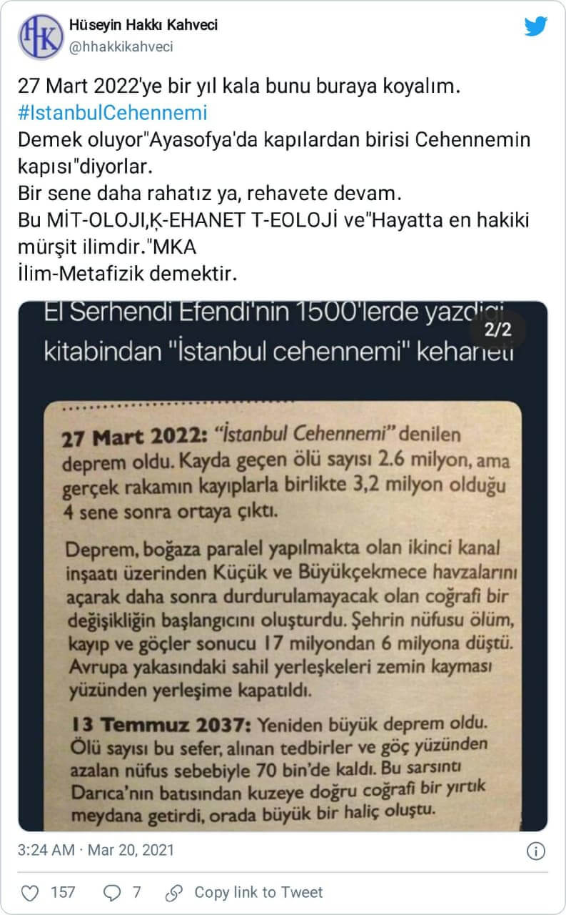İddia o ki, El Serhendi Efendi adlı bir şahıs yaşadığı 1500’lü yıllarda yazdığı eserde İstanbul’un nüfusunun 2022 yılında 17 milyonu geçeceğini, 27 Mart 2022 tarihinde yaşanacak depremden sonra 2.6 milyon kadar insanın hayatını kaybedeceğini, yaklaşık 4 yıl sonra asıl sayının 3.2 milyon olduğunun bulunacağını aktarmış…