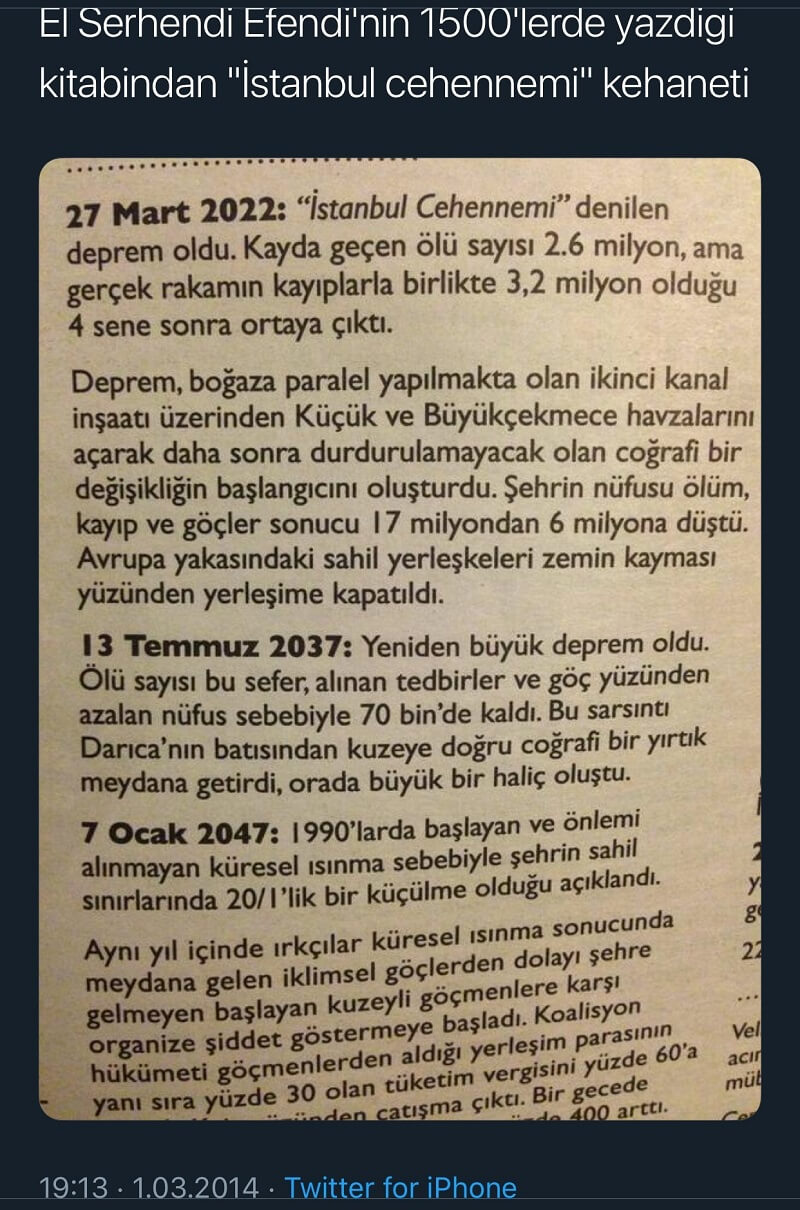 Bahse konu paylaşımlarda alıntılanan “El Serhendi Efendi’nin 1500’lerde yazdığı kitabından “İstanbul cehennemi” kehaneti” notlu 1 Mart 2014 tarihli tweet görseli ise şu şekildeydi:
