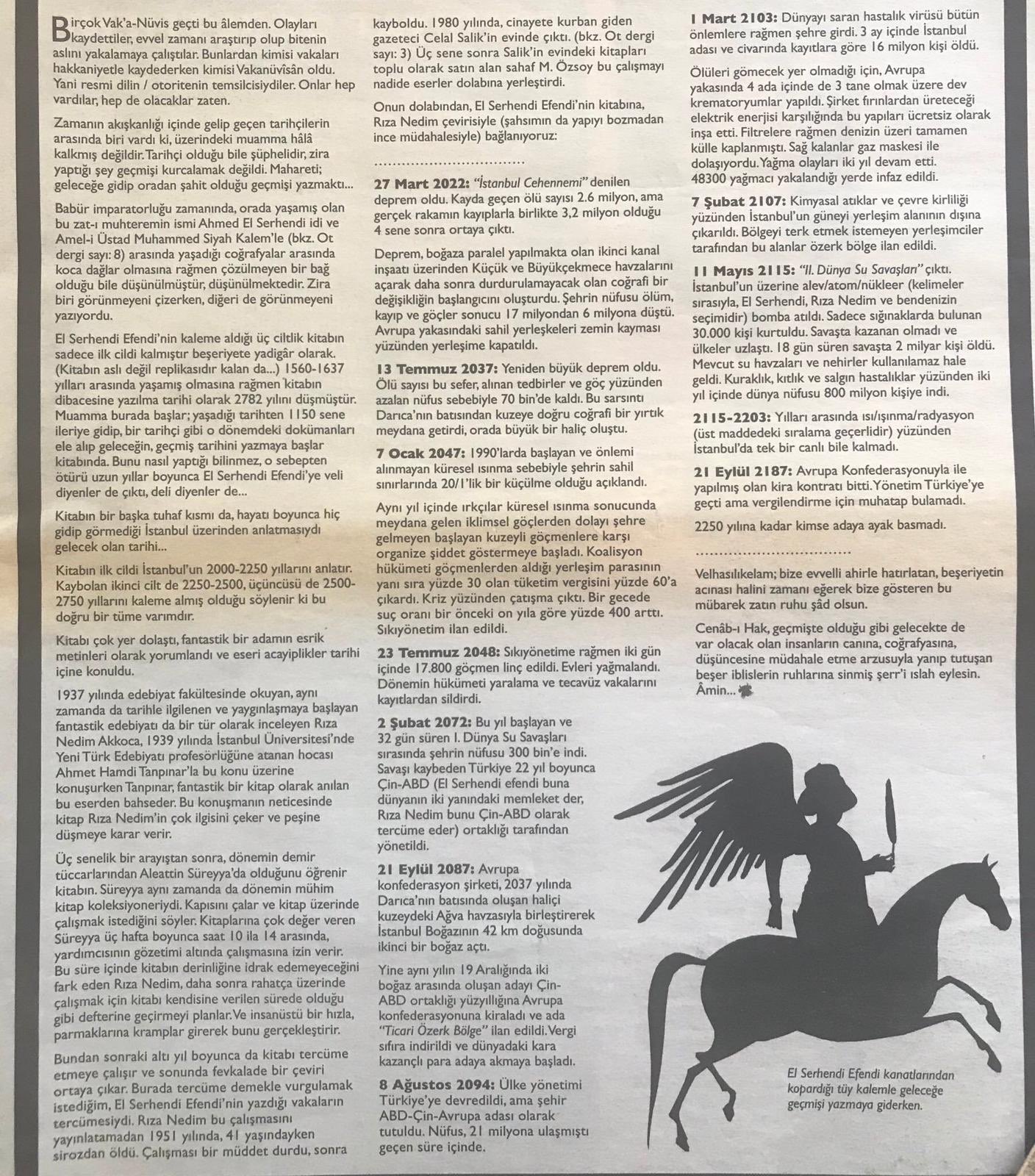 Bu yazının altyapısını da yanılmıyorsam 2005 yılında Trendsetter dergisinde çizgi roman olarak, sonra Radikal gazetesindeki köşemde (Mantığın Bir Anlık Çöküşü) yine çizgili olarak yapmıştım. Ot’ta ise bunu yazı diline getirip, zamanda seyahat eden bir kişinin kaybolan kitabının replikasındaki bilgiler olarak sunup asıl mevzuyu kaleme aldım.