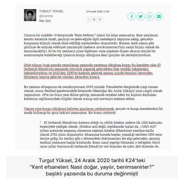 Turgut Yüksel, 24 Aralık 2020 tarihinde K24’te yayımlanan “Kent efsaneleri: Nasıl doğar, yayılır, benimsenirler?” başlıklı yazısında bu duruma şöyle değinmişti: