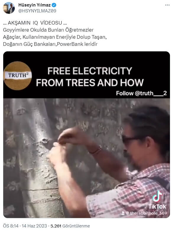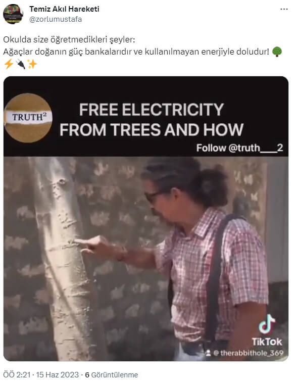 Sosyal medya platformlarında bilim karşıtı profillerce bir videonun “Size okulda öğretmedikleri şeyler: Ağaçlar, kullanılmayan enerjiyle dolup taşan, doğanın güç bankalarıdır!” gibi ifadelerle ağaçların elektrik elde edilebileceği ve güç bankası olarak kullanılabileceği iddiasıyla paylaşıldığı görülüyor.
