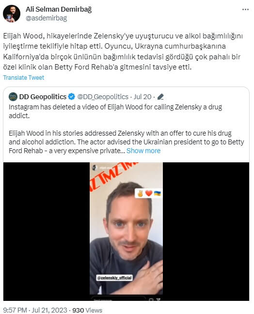 Ali Selman Demirbağ (@asdemirbag): “Elijah Wood, hikayelerinde Zelensky’ye uyuşturucu ve alkol bağımlılığını iyileştirme teklifiyle hitap etti. Oyuncu, Ukrayna cumhurbaşkanına Kaliforniya’da birçok ünlünün bağımlılık tedavisi gördüğü çok pahalı bir özel klinik olan Betty Ford Rehab’a gitmesini tavsiye etti.”