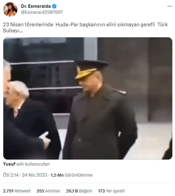 Dr. Esmeralda (@Esmeral42507697): “23 Nisan törenlerinde Huda-Par başkanının elini sıkmayan şerefli Türk Subayı…”