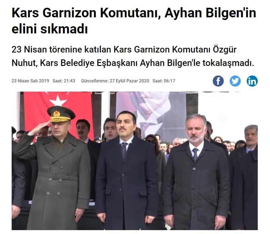 23 Nisan Ulusal Egemenlik ve Çocuk Bayramı kutlama programında protokolde yer alan 14. Mekanize Piyade Tugay Komutanı Tuğgeneral Özgür Nuhut kendisiyle tokalaşmak isteyen Kars Belediye eş başkanları Ayhan Bilgen ve Şevin Alaca’ya elini uzatmamıştı.
