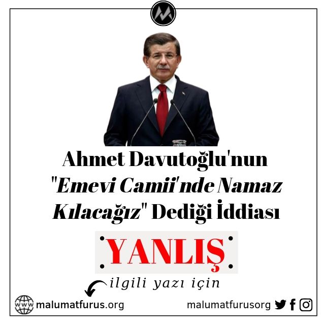 Ahmet Davutoğlu’nun Suriye’de iç savaşın patlak verdiği dönemde “Şam’da Emevi Camii’nde Namaz Kılacağız” dediği iddiası doğru değil. Bahse konu söz Cumhurbaşkanı Erdoğan tarafından 5 Eylül 2012 tarihinde yaptığı bir konuşmada dile getirilmiştir.