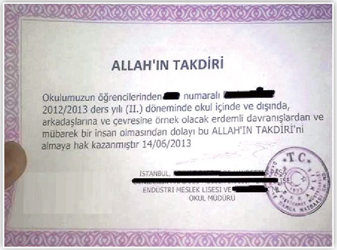 Derslerinde başarı gösteren öğrencilere verilen klasik “Takdir” ve “Teşekkür” belgeleri yerine “Allah’ın Takdiri Belgesi” şeklinde bir belge dağıtıldığı iddiası asılsızdır.