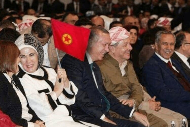“PKK bayrağı sallayan cumhurbaşkanı eşi” gibi ifadelerle 2015 yılında dolaşıma sokulan ve aradan geçen zamanda paylaşılmaya devam edilen montaj içeren görsel şöyle: