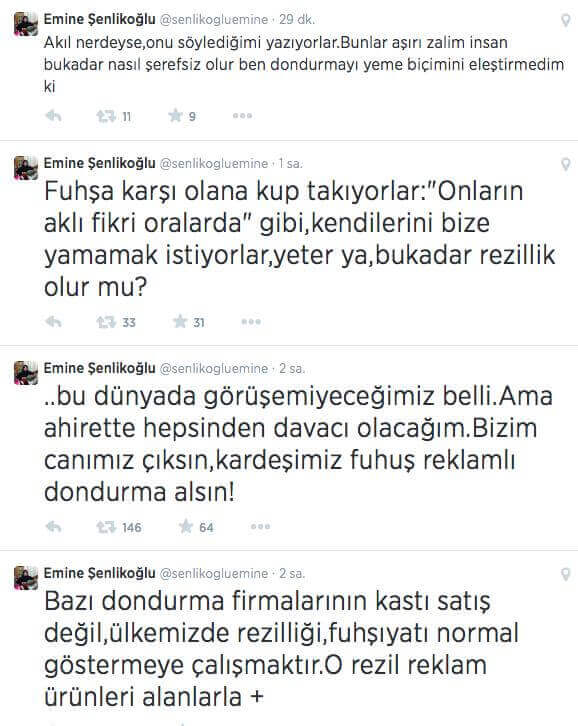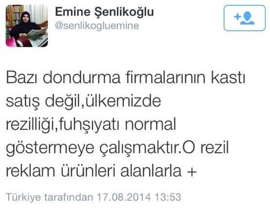 Emine Şenlikoğlu 17 Ağustos 2014 tarihinde Twitter hesabı üzerinden yaptığı paylaşımlarda “Bazı dondurma firmalarının kastı satış değil, ülkemizde rezilliği, fuhşıyatı normal göstermeye çalışmaktır. O rezil reklam ürünleri alanlarla bu dünyada görüşemiyeceğimiz belli. Ama ahirette hepsinden davacı olacağım. Bizim canımız çıksın, kardeşimiz fuhuş reklamlı dondurma alsın!” ifadelerini kullanmış (Senlikogluemine uzantılı Twitter hesabı kapandığı için arşiv bağlantısı sunulamasa da ilgili paylaşımlara diğer sosyal medya kullanıcılarının verdiği yanıtlar görülebiliyor).