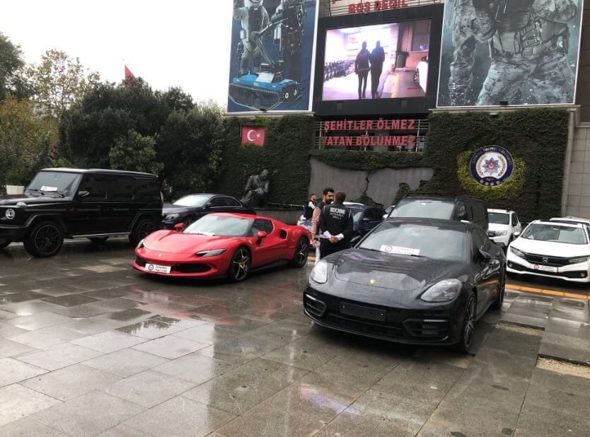 Komançero Çetesi’nden ele geçirilen ve aralarında Porsche, Ferrari ve Bentley marka lüks araçların bulunduğu arabalar giydirme yapılarak polis aracı haline getirilmiş.
