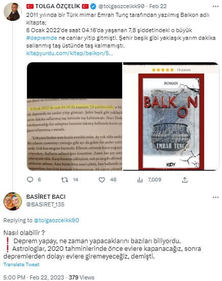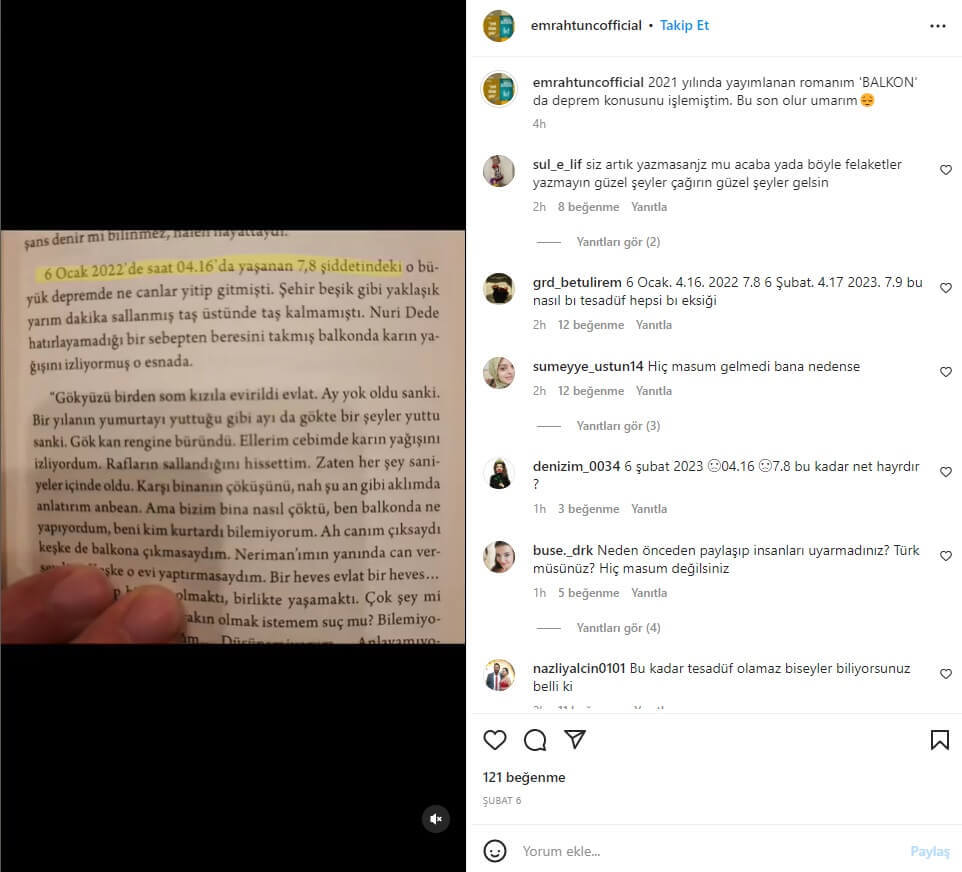 Afetin ardından mimar ve yazar Emrah Tunç’un Balkon adlı romanında depremin tarih ve saatini bildiği yönünde absürt bir iddia sosyal medyada dolaşıma girmiş.