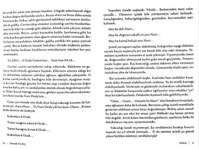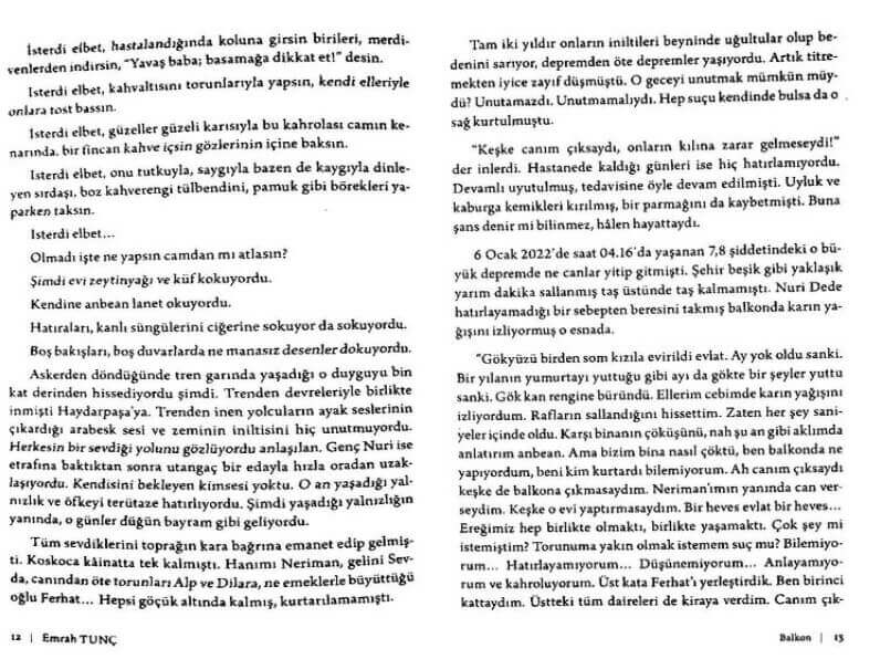 “6 Ocak 2022’de saat 04.16’da yaşanan 7,8 şiddetindeki o büyük depremde ne canlar yitip gitmişti. Şehir beşik gibi yaklaşık yarım dakika sallanmış taş üstüne taş kalmamıştı. Nuri Dede hatırlayamadığı bir sebepten beresini takmış balkonda karın yağışını izliyormuş o esnada.”