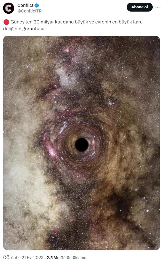 Conflict (@ConflictTR): “Güneş’ten 30 milyar kat daha büyük ve evrenin en büyük kara deliğinin görüntüsü:”