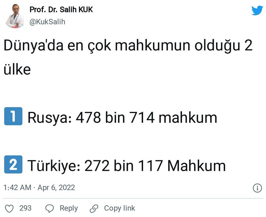 Türkiye’nin Dünyada Toplamda ya da Nüfusuna Oranla En Çok Mahkûmun Olduğu 2. Ülke Olduğu İddiası Doğru Değil
