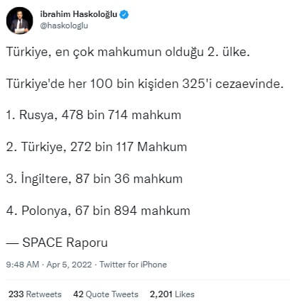 Rapor verileri, listenin ikinci sırasında yer alan ülkemizde her 100 bin kişiden 325’inin cezaevinde olduğunu, Avrupa genelinde ise her 100 bin kişide 102 mahkûmun cezaevinde bulunduğunu, mahkûm sayısının nüfusa oranı açısından Türkiye’nin Avrupa ortalamasının 3 katını geçtiğini işaret ediyor.