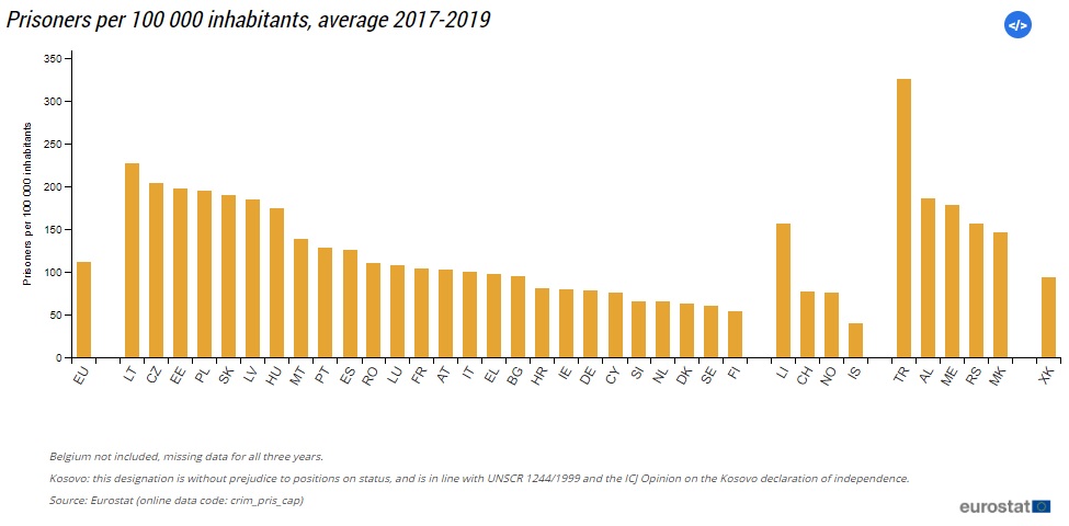 Eurostat verilerine göre Türkiye Avrupa Birliği (AB) üyesi ve üye ülkeleri arasında nüfusuna oranla en yüksek hapishane mevcuduna sahip.