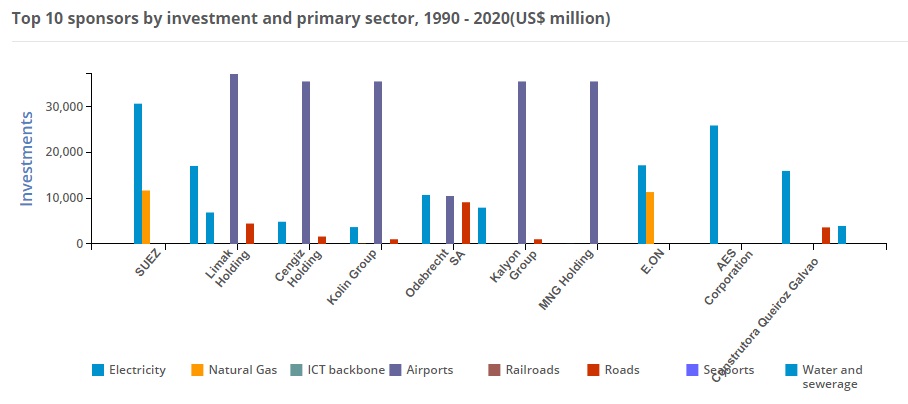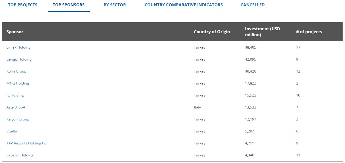 Dünya Bankası’nın “Altyapı Yatırımlarına Özel Sektör Katılımı Veri tabanı” (“Private Participation in Infrastructure Database“) verilerine göre 1990-2020 yılları arasında en çok ihale alan şirketler listesinde Limak 2., Cengiz 4., Kolin 5., Kalyon 6., MNG 7. sırada yer almış.