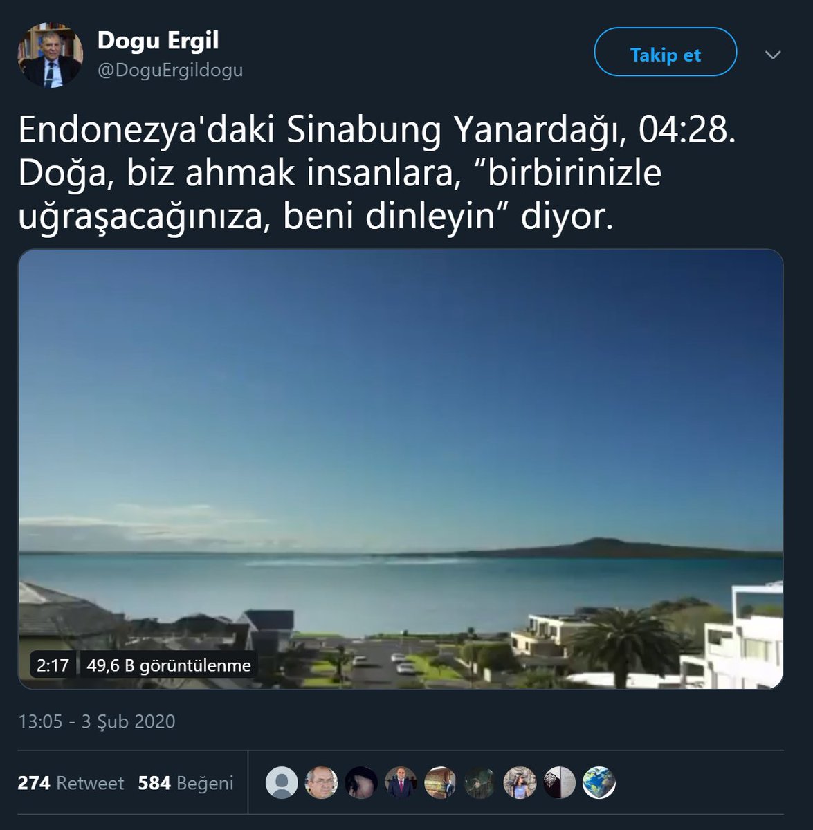 Habertürk ve Bugün gibi çeşitli yayınlarda köşe yazarlığı yapmış olan Doğu Ergil, sosyal medya hesabından yaptığı 3 Şubat 2020 tarihli bir paylaşımda Sinabung Yanardağı’nın patlama anına ait sanılan videoyu paylaşmıştı:
