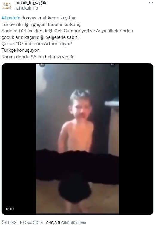 Av.Burcu ASLAN (@av_burcuaslan): “Çocuk Türkçe “Özür dilerim Arthur” diyor. #Epstein dosyasıyla alakası olduğunu düşünmüyorum ama bu çocuk kim ? Bu korkunç videonun etkisinden çıkamıyorum, sağlıklı düşünemiyorum ! İşkence gören bu çocuğun videosu nereden nasıl geldi ?”