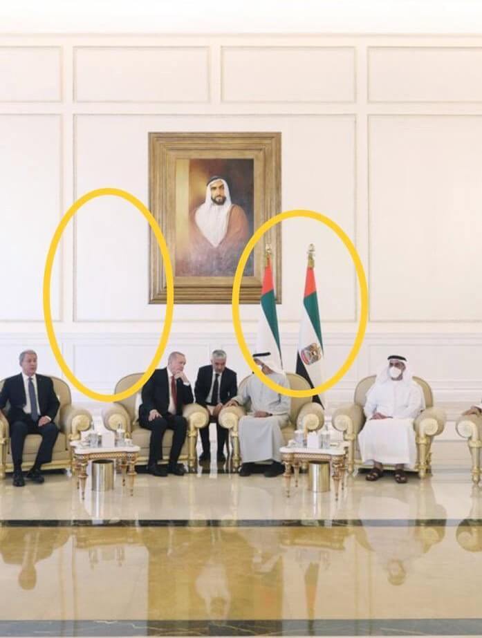 Cumhurbaşkanı Recep Tayyip Erdoğan, Birleşik Arap Emirlikleri (BAE) Devlet Başkanı Şeyh Halife Bin Zayed El Nahyan’ın vefatı nedeniyle 17 Mayıs 2022 günü BAE’ye taziye ziyaretinde bulunmuştu. Cumhurbaşkanı Erdoğan’ın başsağlığı dileklerini BAE’nin yeni Devlet Başkanı Şeyh Muhammed bin Zayed el Nahyan’a ilettiği ikili görüşmede salonda BAE bayrağının yanında Türkiye Cumhuriyeti bayrağının yer almaması kamuoyunda eleştiri konusu olmuştu. Ancak bu eleştiriler, resmî olmayan taziye ziyaretinde uygulanan protokol kurallarını göz ardı etmiş.