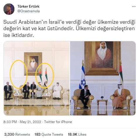 Paylaşımda aslında 3 hata mevcut: (i) Suudi Arabistan bayrağı ile Birleşik Arap Emirlikleri bayrağı karıştırılmış. (ii) İsrail Cumhurbaşkanı Isaac Herzog’un BAE ziyaretinden fotoğraf güncel değil, 2022 yılı Ocak ayından. (iii) bayrak protokolü anlaşılamamış.