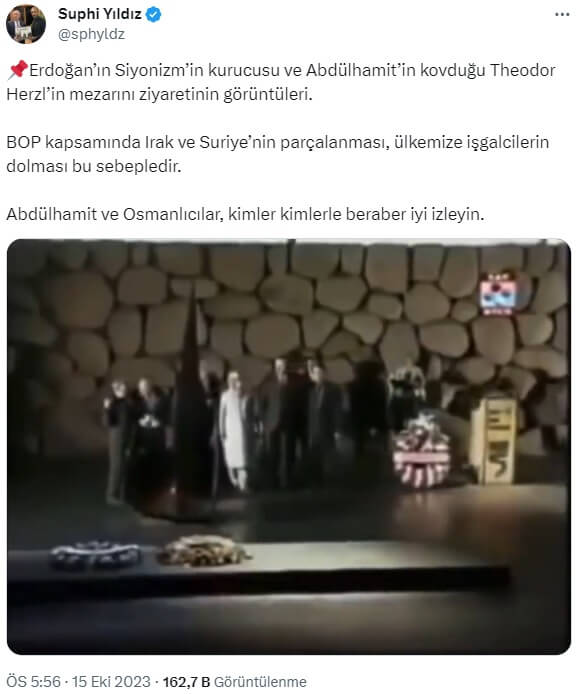Suphi Yıldız (@sphyldz): “Erdoğan’ın Siyonizm’in kurucusu ve Abdülhamit’in kovduğu Theodor Herzl’in mezarını ziyaretinin görüntüleri. BOP kapsamında Irak ve Suriye’nin parçalanması, ülkemize işgalcilerin dolması bu sebepledir. Abdülhamit ve Osmanlıcılar, kimler kimlerle beraber iyi izleyin.”